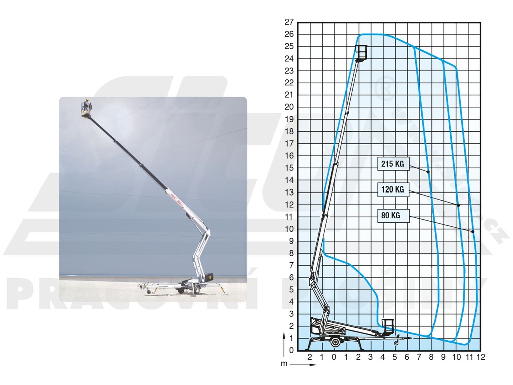 Stroj pokrývá velkou pracovní plochu a stabilitu zajišťují 4 nezávisle ovládané podpěry. Při zatížení koše 80kg disponuje stranovým dosahem až 11,7m, při 120kg potom 10,7m a při plném zatížení, tedy 215kg v koši, je dosah omezen na 8,6m. Plošina disponuje vlastním pojezdem a je možné ji ustavit i ve svažitém terénu. Díky nízké hmotnosti jsou přívěsné plošiny vhodné pro rychlý a jednoduchý transport. Bezpečnost pracovníka jistí propracovaný systém dvojnásobného jištění, hydraulických zámků a přepouštěcích ventilů. Provoz je možný na vestavěný benzínový motor, případně na elektrický proud o napětí 230V. Naše novější 260XT mají komfortní ovládání pojezdu pomocí odnímatelného ovladače.