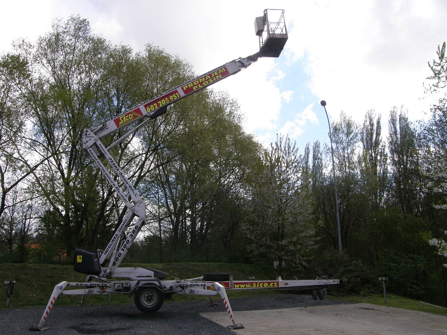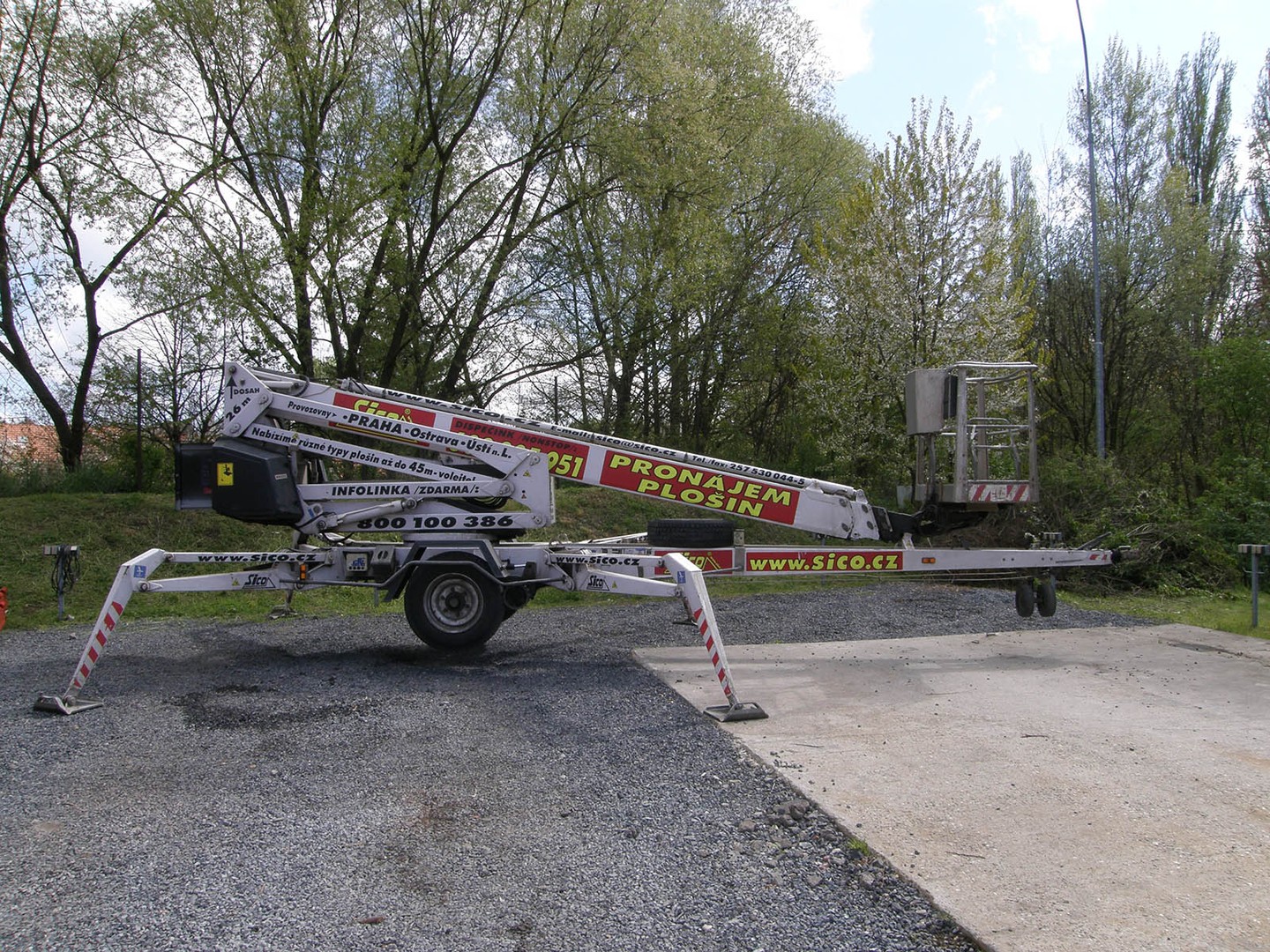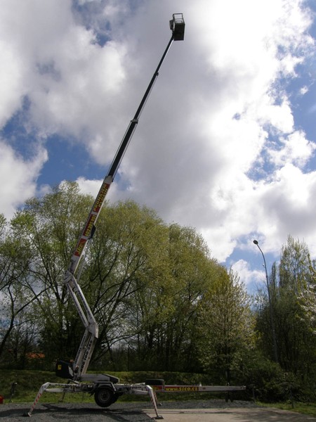 Náš druhý nejvyšší “přívěs”. Váží necelé 3,5 tuny a umožní práci ve výšce až 26 metrů! Kloubovo-teleskopická konstrukce, nekonečná otoč a koš s možností rotace o 90°.