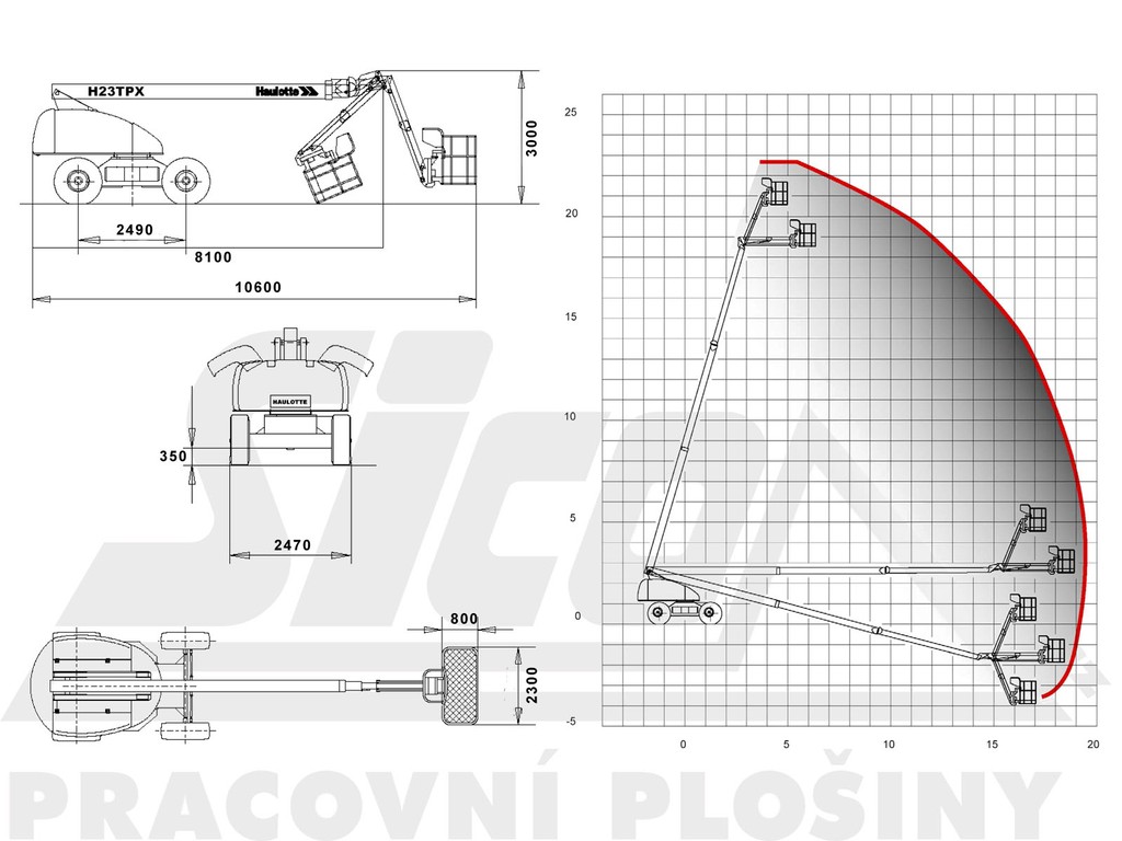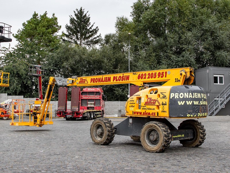 Teleskopická pracovní plošina Haulotte H 23 TPX s maximální pracovní výškou 22,6 metrů se perfektně hodí pro práce v obtížných terénních podmínkách. Obě nápravy jsou poháněné, stroj je vybaven pohonem na všechna 4 kola, uzávěrkou diferenciálu a velkými terénními pneumatikami pro maximální průchodnost obtížným terénem. Otočný pracovní koš s nosností 230 kilogramů je upevněn na vertikálně pohyblivém JIB ramenu v rozsahu 140°. Nekonečná otoč, plně proporční precizní ovládání a velký pracovní rozsah zajišťují maximální pracovní efektivitu. H 23 TPX je schopna pojezdu ve zcela vysunutém stavu. Pracovní plošina splňuje všechny přísné bezpečnostní předpisy a mezinárodní normy.