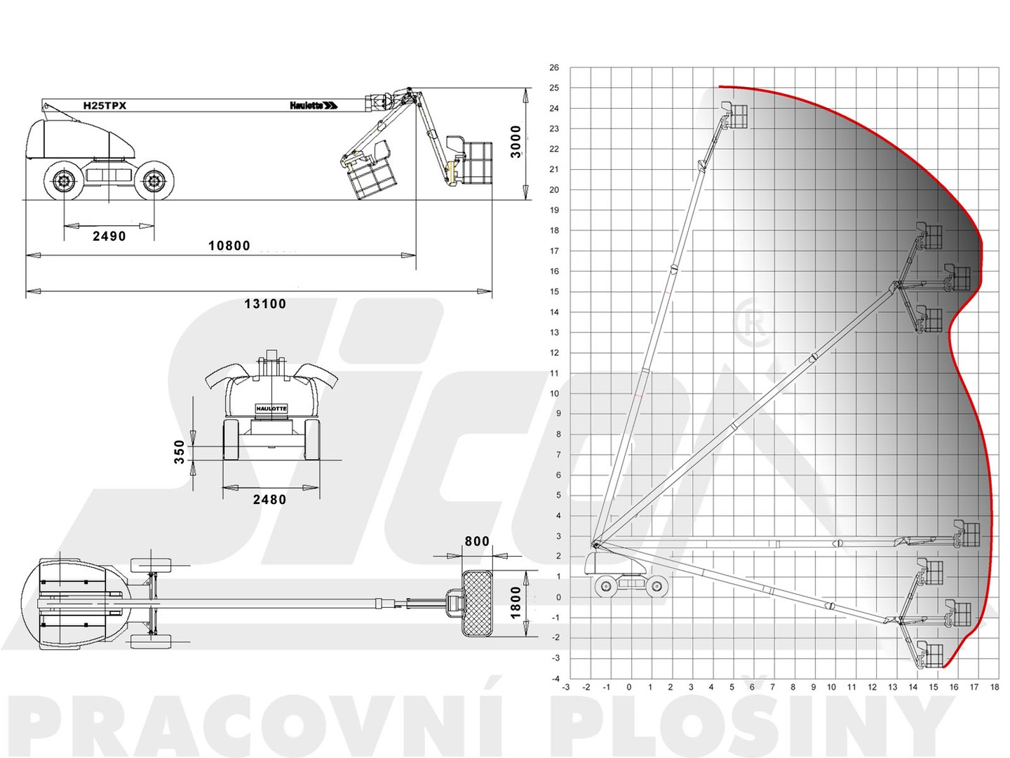 Teleskopická pětadvacítka Haulotte H 25 TPX je všestranné zdvihací zařízení pro práce v obtížných terénních podmínkách ve výšce až 25,3 metrů. Obě nápravy jsou poháněné, stroj je vybaven pohonem na všechna 4 kola, uzávěrkou diferenciálu a velkými terénními pneumatikami pro maximální průchodnost obtížným terénem.