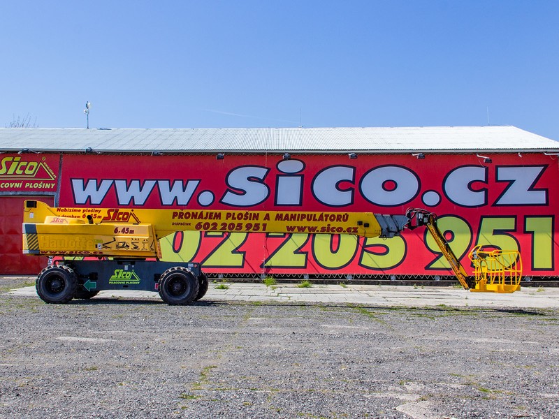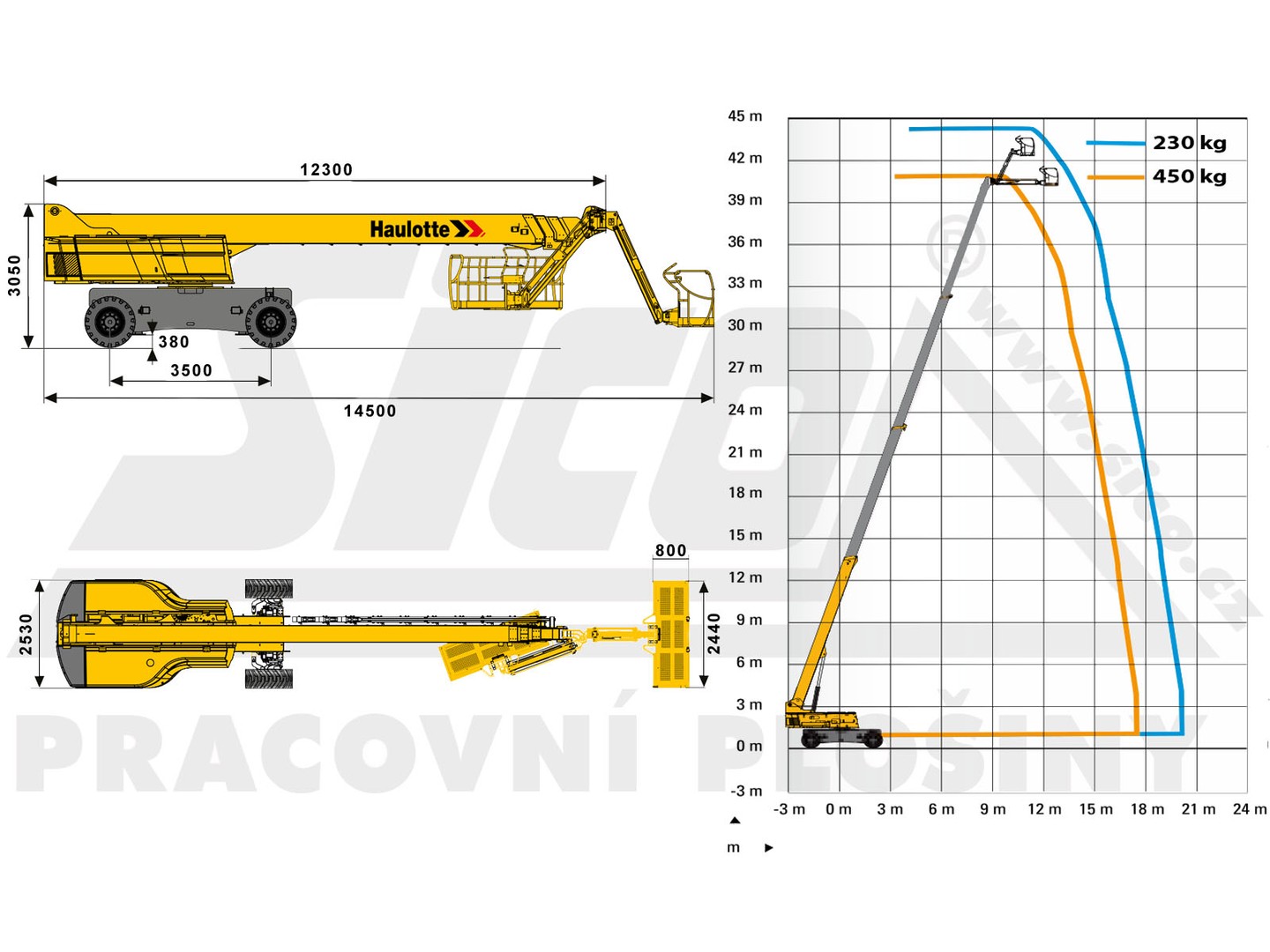 Impozantní pracovní výška 43 metrů a stranový dosah 20 metrů jsou bezkonkurenční!Společně s HT 43 RTJ PRO je pracovní teleskopická plošina Haulotte H 43 TPX naše nejvyšší teleskopická plošina. O pohon se stará dieselový agregát, poháněná jsou všechna 4 kola. Pro pohyb v obtížném terénu je stroj vybaven hydraulickou uzávěrkou diferenciálu. Všechna 4 kola také zatáčí, přední náprava je výkyvná, stroj má stoupavost až 40%. Ultimátní stroj, který se hodí do obtížných podmínek, ve kterých vás nezklame.Hydraulicky ovládané rameno s otočným pracovním košem o 174° připevněným na JIB ramenu pohyblivém v rozsahu 140° vertikálně dovoluje pracovníkům v koši dosáhnout i do nejméně přístupných míst. Otočnou nástavbou s ramenem a pracovním košem je možné otáčet vzhledem k podvozku o 360° stupňů. Perfektní výkon má montážní plošina díky robustní konstrukci, velkým kolům a výkonnému dieselovému agregátu. Při ustavení se rozšíří rozchod obou náprav a stabilní konstrukce pak dovoluje pojezd plošiny s vysunutým ramenem.