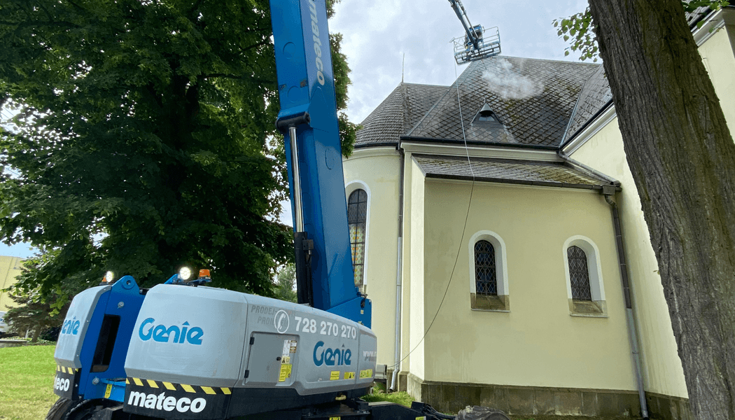 Jelikož se kostely řadí mezi skutečně vysoké stavby, při opravách a údržbách jsou naše pracovní plošiny nepostradatelnými pomocníky. V tomto konkrétním případě byla v rámci projektu využita kloubová plošina Genie ZX-135/70. Vzhledem ke své konstrukci se jedná o ideální stroj pro venkovní využití na stavbách a v průmyslu.