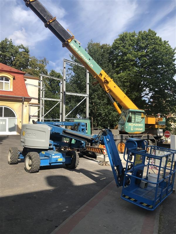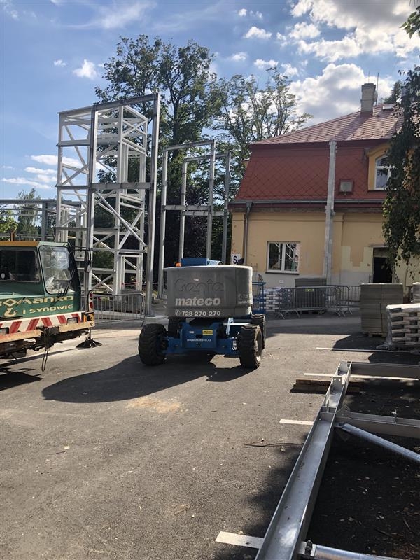 Při výstavbě ocelových propojovacích lávek mezi jednotlivými pavilony v Rehabilitačním ústavu Chuchelná byla využita naše služba pronájmu pracovních plošin v Chuchelné. Vzhledem k výškovému rozsahu prací a složité přístupnosti mezi budovami byla nasazena kloubová plošina Genie Z-51/30.