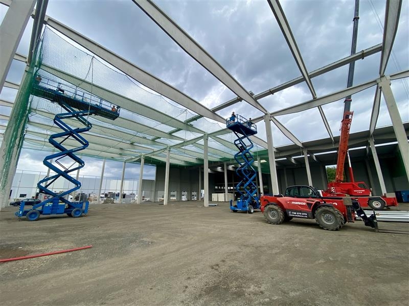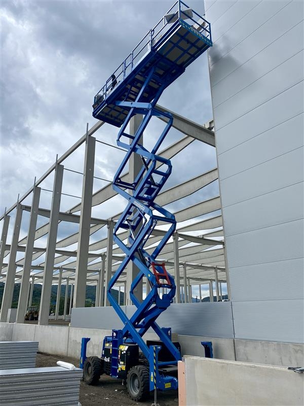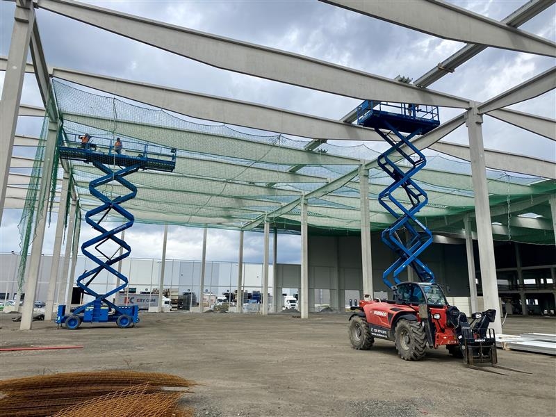 Pro práce ve výškách byly využity stroje z kategorií nůžkové pracovní plošiny, konkrétně Genie GS-5390, a kloubové pracovní plošiny, typy Genie Z-45XC a Genie Z-51/30 JRT. Tyto pracovní plošiny zajistily bezpečný přístup do všech potřebných výškových úrovní a umožnily efektivní provádění montážních i dokončovacích prací na konstrukci hal.